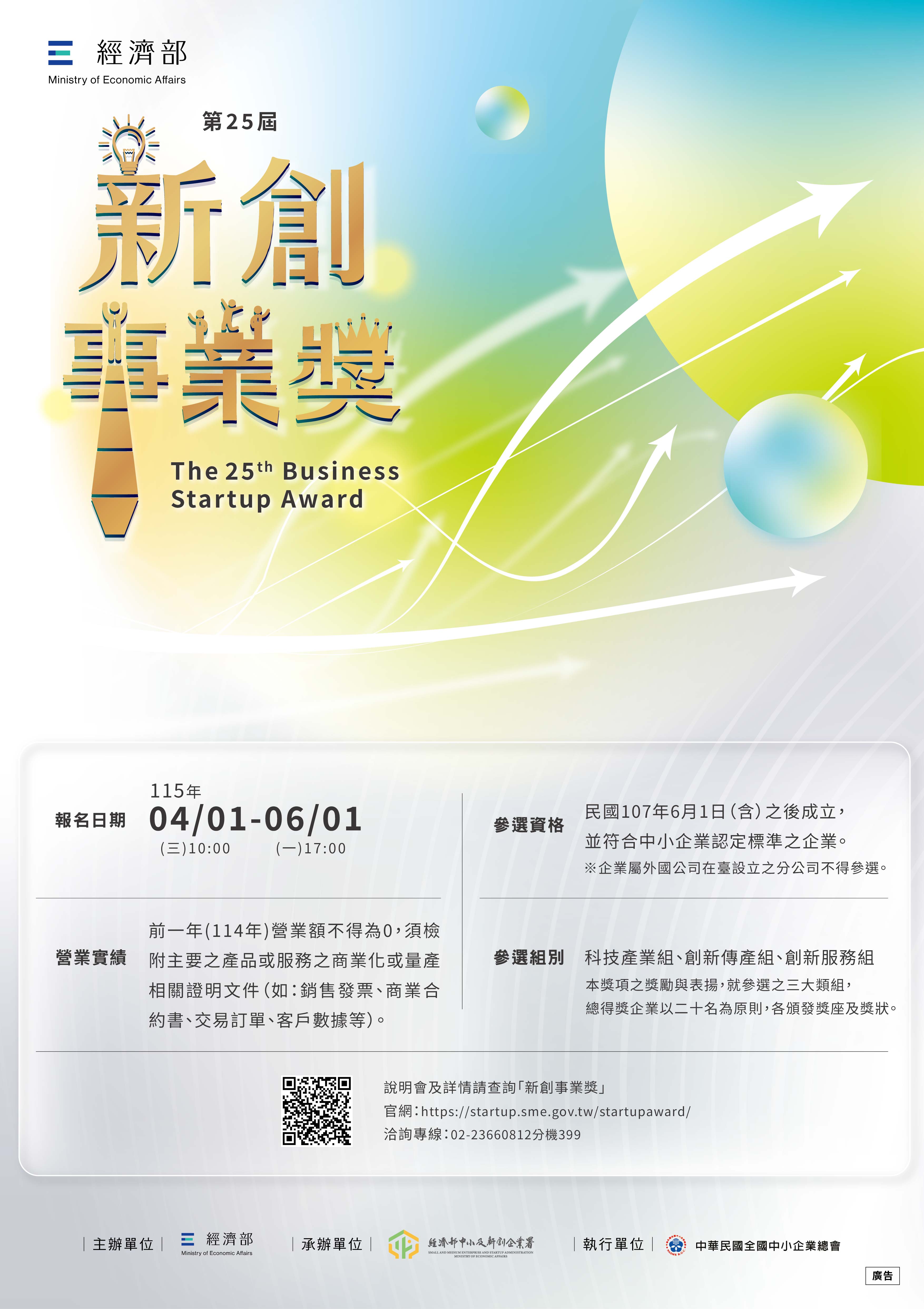 四、詳細參選資格及申請方式,請參閱網站https://startup.sme.gov.tw/startupaward/