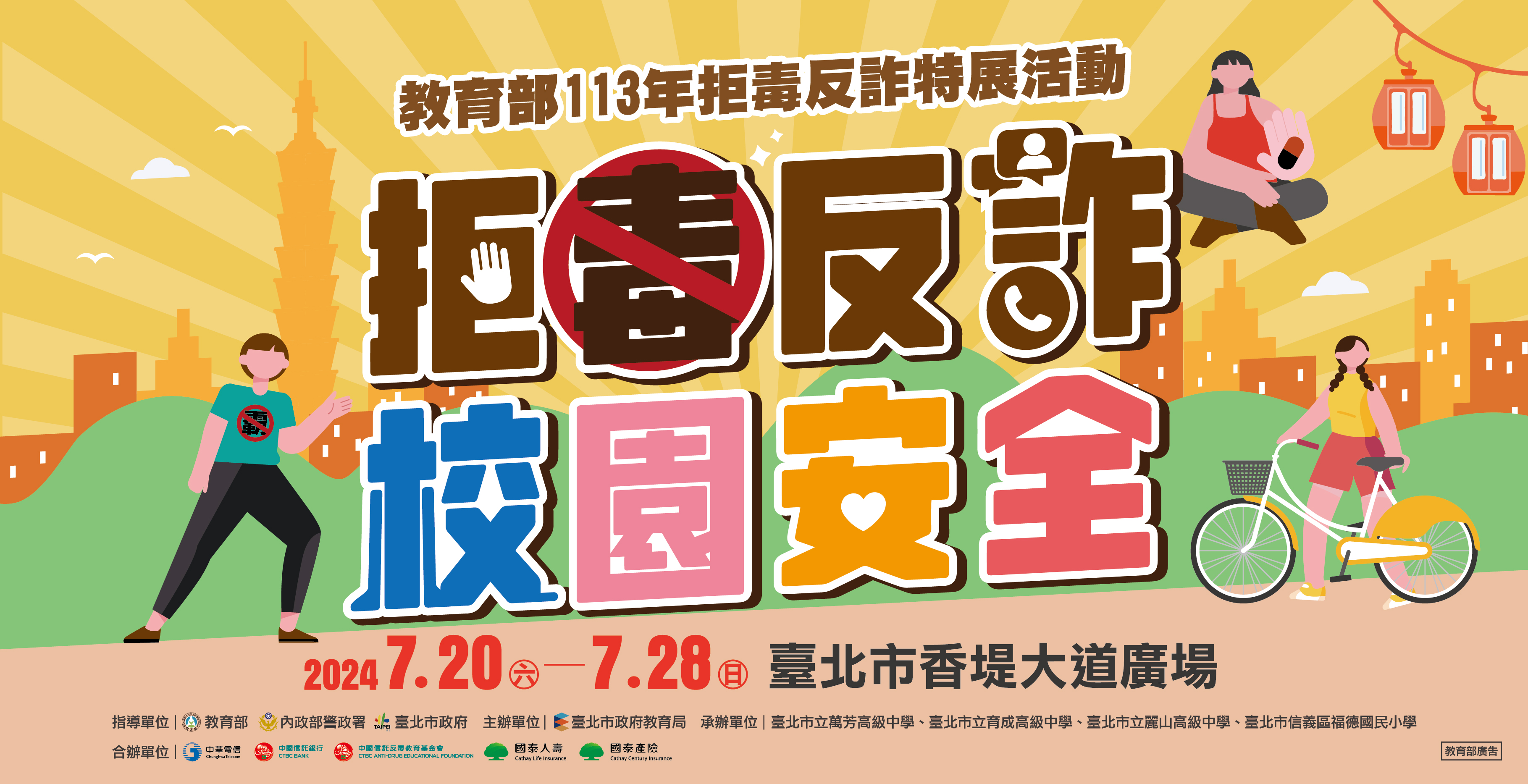 教育部與臺北市政府於7月20日(六)至7月28日(日)在信義香堤廣場舉辦教育部113年拒毒反詐特展活動,今年結合反毒、反詐、反霸凌與交通安全,邊學邊玩邊闖關,有機會獲得限量禮品哦!