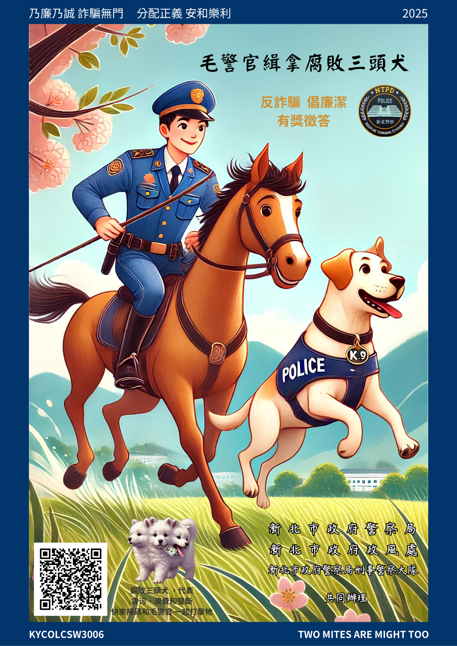 新北市政府警察局辦理「『毛警官緝拿腐敗三頭犬』反詐騙倡廉潔有獎徵答活動」,希望能藉以提升社會大眾反腐敗、反詐騙意識,弘揚蘊含「正德、利用、厚生」的傳統廉政精神。