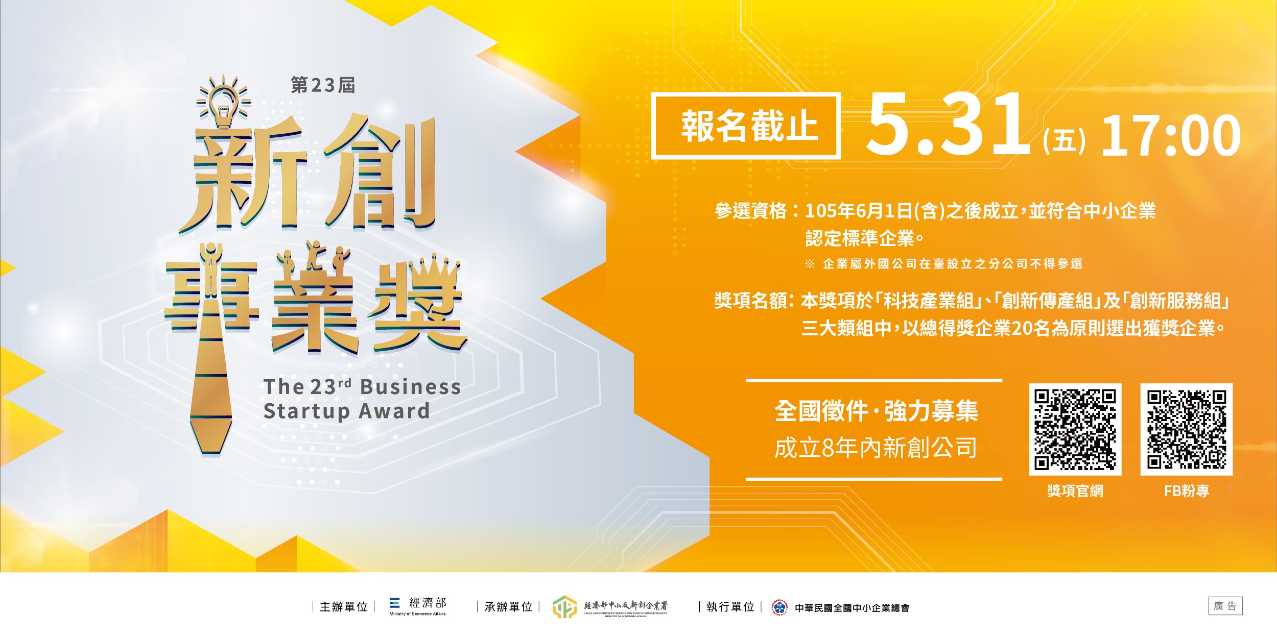 二、獎項資訊:以「科技產業組」、「創新傳產組」及「創新服務組」三大類組中,以總得獎企業20名為原則選出獲獎企業