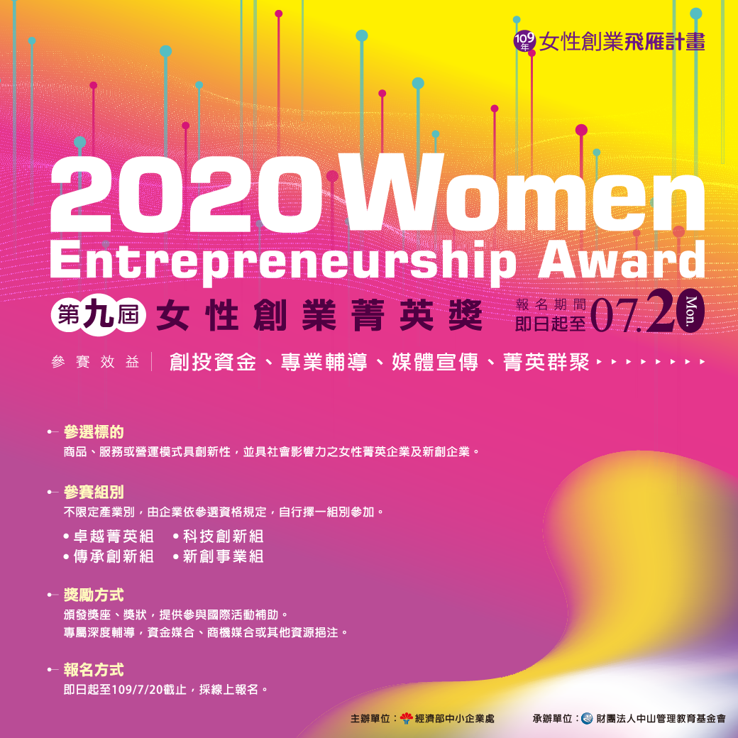 為表揚女性創業典範,帶動女性創業風潮,特辦理「第九屆女性創業菁英獎」選拔活動。藉由遴選國內具創新性商品、服務或營運模式的女性菁英企業或新創企業,對其創業歷程、創新模式及社會影響力進行表彰,期能培育女性企業亮點,傳承女性創業精神,進而鼓舞更多國內女性投身創業活動,創造經濟成長動能。