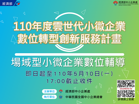 由經濟部中小企業處委託中華民國全國中小企業總會辦理之「110年度雲世代小微企業數位轉型創新服務計畫」-場域型小微企業數位輔導即日起受理提案。