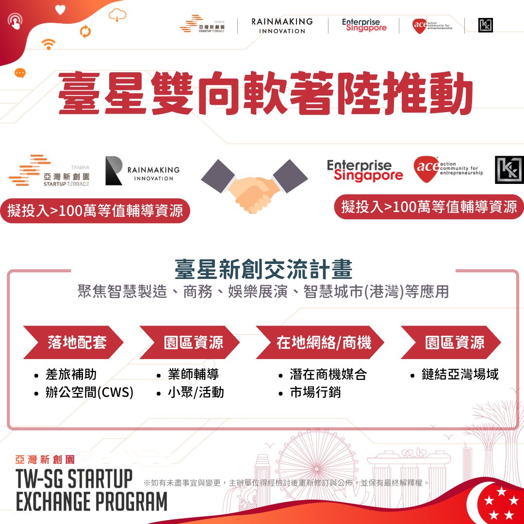 亞灣新創園將攜手新加坡創育機構Action Community for Entrepreneurship(ACE)、KK Fund,共同合作辦理臺星新創交流計畫,並與Rainmaking Innovation、500 global、Mesh Ventures、Genesis、Vynn Capital、SAP.iO、e27….等創投、加速器、社群媒體與企業鏈結,編織最全面的資源網絡,建構臺灣新創落地新加坡的基礎。