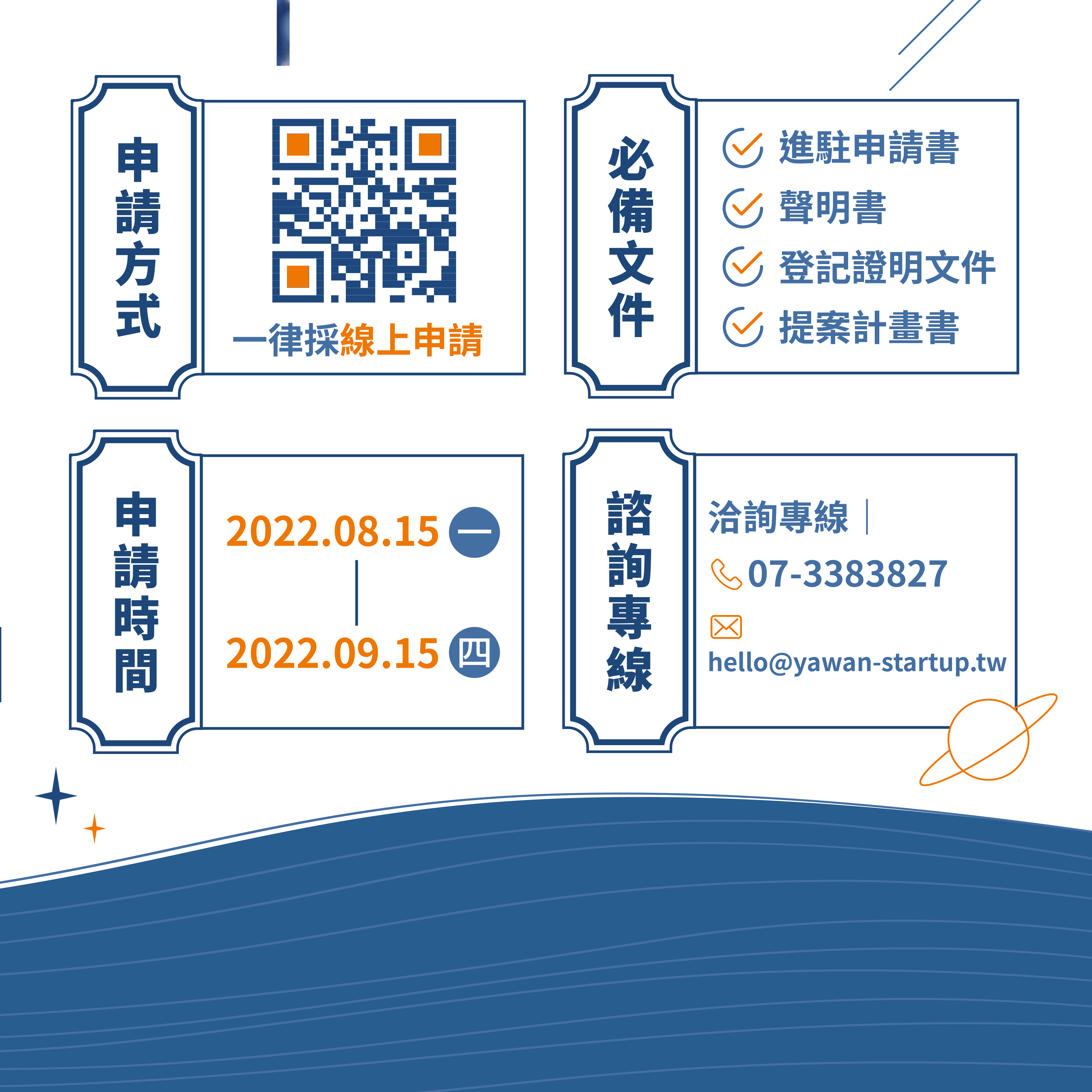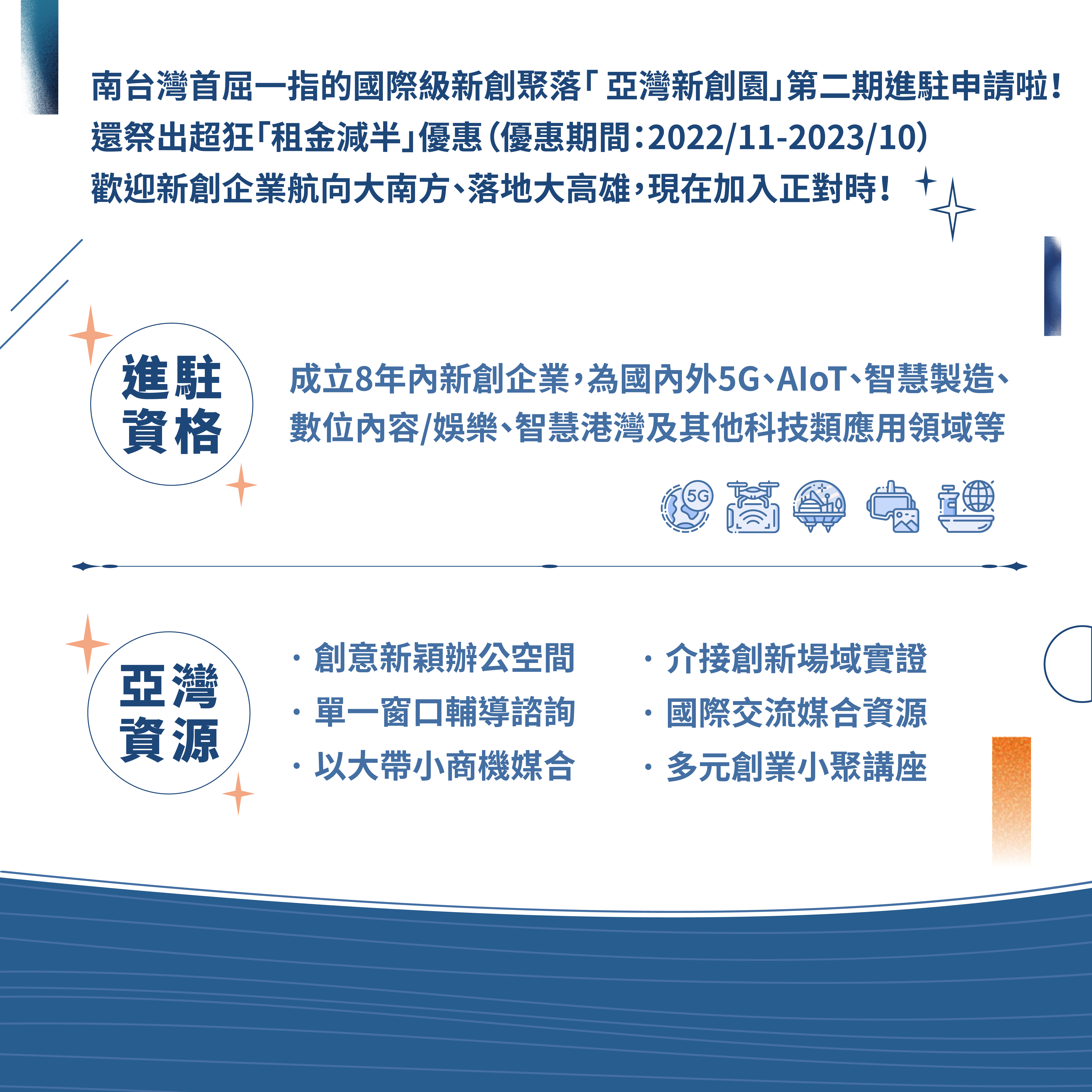 新創夥伴們快手刀準備計畫書,就有機會進駐高雄最完整的國際新創聚落!想了解園區更多資訊,快來電詢問!►洽詢電話:(07)338-3827 ►信箱:hello@yawan-startup.tw►地址:高雄市前鎮區成功二路25號3F-1►亞灣新創園官網:https://www.yawan-startup.tw/