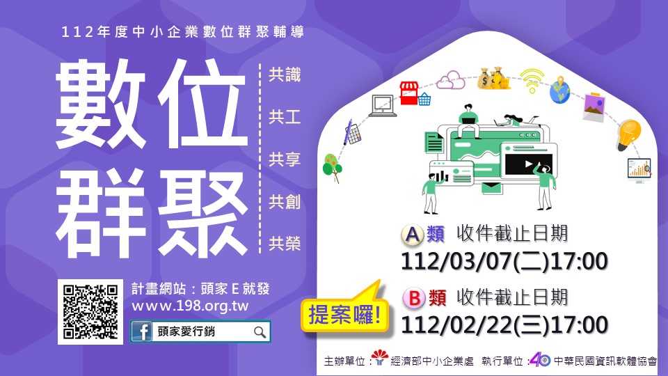 由經濟部中小企業處委託中華民國資訊軟體協會辦理之「112年度中小企業數位群聚輔導」,提案作業規範即日起公告,透過【線上系統】受理收件,歡迎各地中小企業組成「數位群聚」踴躍提案。