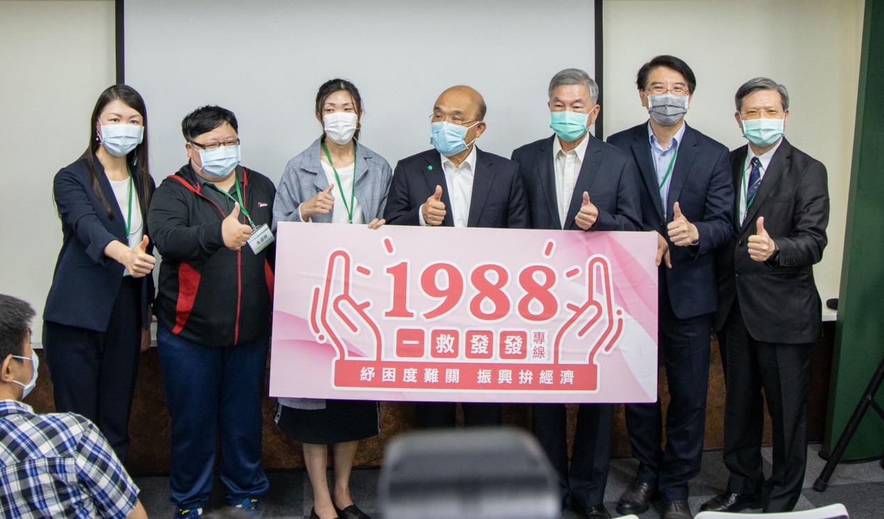 蘇院長由經濟部沈榮津部長等人陪同視察「1988紓困振興專線」客服中心,並聽取中小企業處何晉滄處長業務報告,指出「1988紓困振興專線」自4月6日起,行政院龔明鑫政務委員每日召開紓困記者會後,來電量不斷攀升,平均每天超過3,500通來電,剛開始僅有40名客服人員,趕不上民眾諮詢速度。為此,自4月20日起已陸續增補客服人力,目前已達100席客服人員,接聽率也來到90%以上,在5月4日將持續擴增到110席客服人員,讓接聽率更高,民眾等待時間更短,回復品質更佳,服務做得更好。