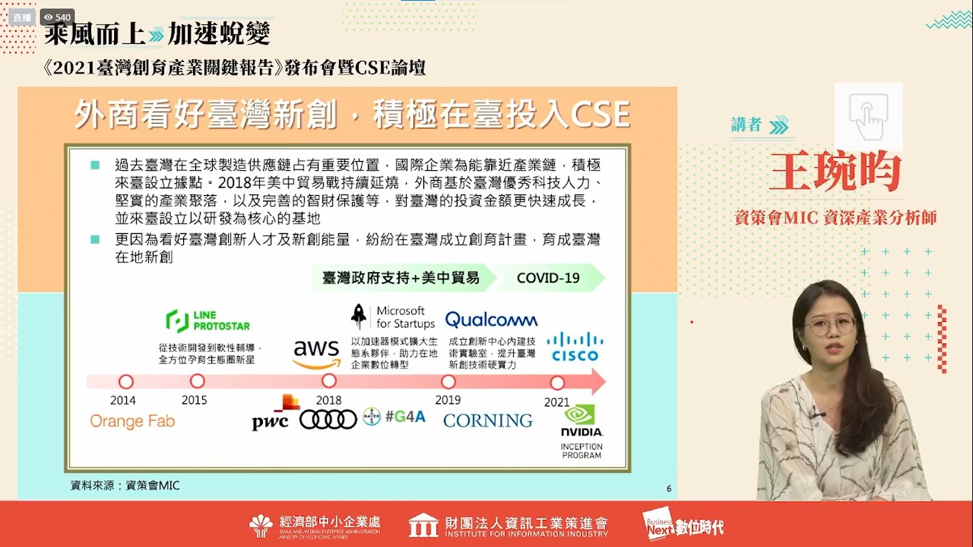 《2021臺灣創育產業關鍵報告》從「企業創新」、「創業投資」、「新創培育」三個角度,描繪臺灣產業及新創生態圈樣貌,加速國內外優秀創業人才瞭解臺灣產業優勢及創育資源,並探討「企業參與新創(Corporate Startup Engagement, CSE)」之案例及趨勢,成為中大企業投入臺灣創育產業、數位轉型的參考與指引。活動上邀請鴻海晶片設計中心、互貴興業、開源智造、數位無限等各界專家深度對談,期盼藉由合作經驗的分享,帶動更多臺灣企業與新創跨界交流與合作。