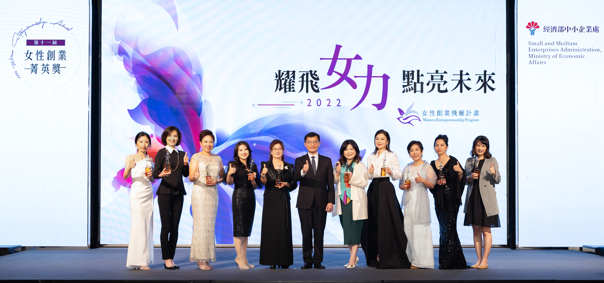 第11屆「女性創業菁英獎」得獎名單出爐,從「卓越經營組」及「傳承轉型組」兩個獎項組別中,精選10大傑出創業女性,今年首次增設「綠色企業特別獎」,於11月18日(五)在臺北大直典華舉行頒獎典禮,由經濟部中小企業處何晉滄處長為本屆優秀得獎企業頒獎,給予女性創業家最大的勉勵與支持。