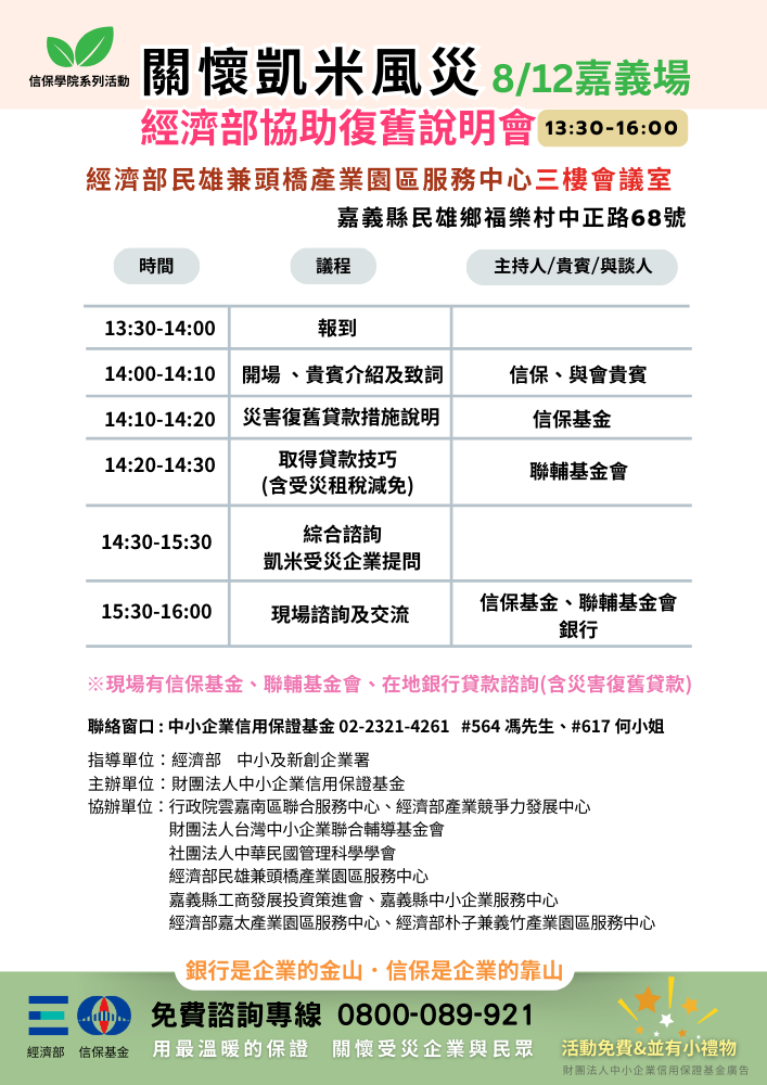 為因應凱米颱風對企業及民眾所造成之損害,自7月31日起啟動「關懷凱米風災、經濟部協助復舊」說明會,與會將邀請專人及輔導顧問分享災害復舊貸款及受災租稅減免等相關資訊,現場亦有金融機構與業者進行交流及提供諮詢,歡迎有需要之企業及民眾皆可來報名參加,讓我們來協助您早日恢復營運。